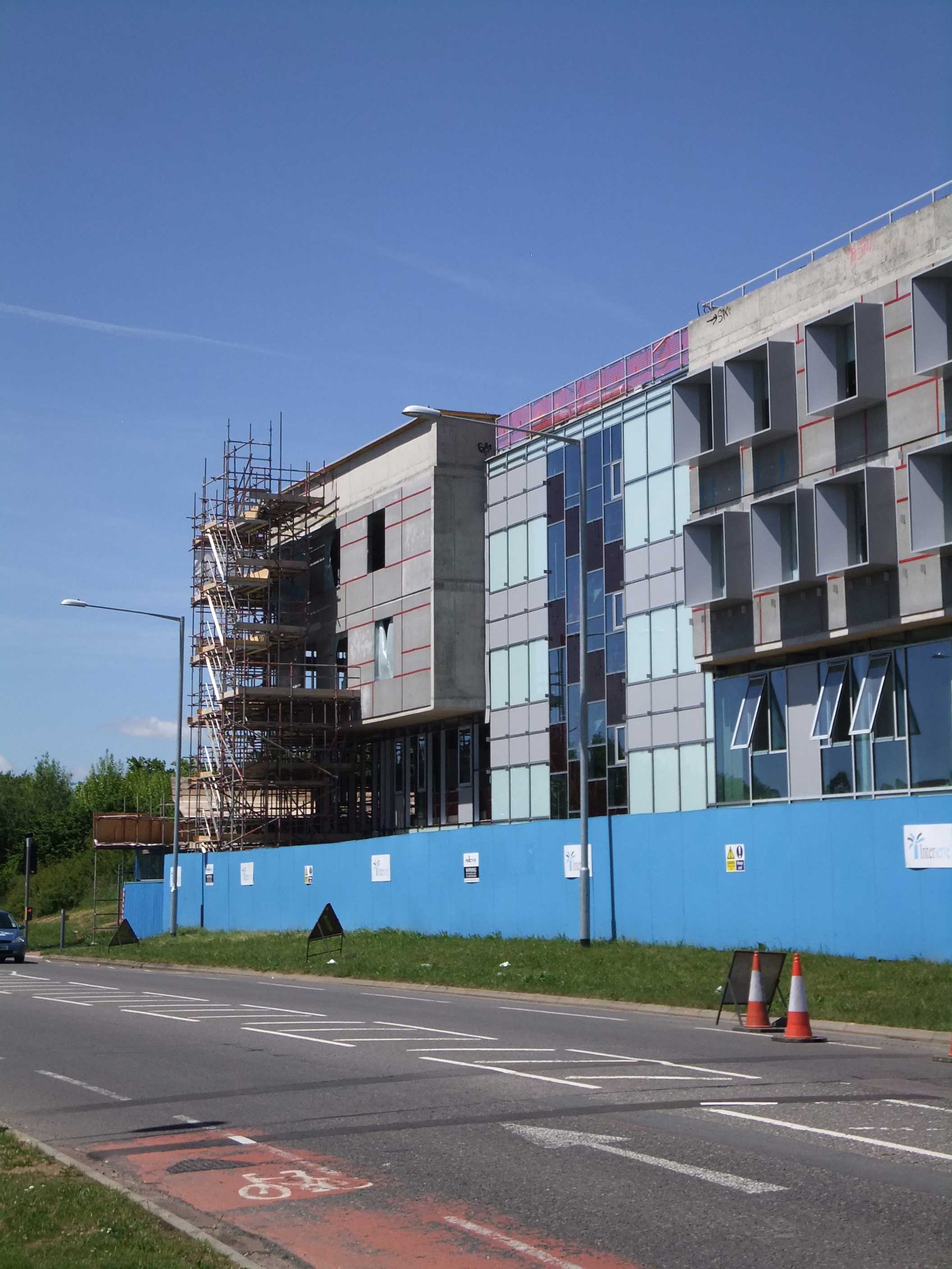 We were engaged to monitor the construction of this building. Although the structure is of conventional reinforced concrete on piled foundations, the building incorporates a number of features to minimize its environmental impact and energy use. Passive shading and other features help to maintain steady internal temperatures and avoid the need for air-conditioning. Energy inputs are supplemented by extensive solar panel arrays on the roof and by photo-voltaic glazing on the front elevation. Construction proceeded under exceptionally adverse winter conditions, when measures are required to protect new concrete from frost without significant delays to the contract programme. We were able to monitor and advise on these measures, an on subsequent hand-over and ‘de-snagging’ at completion.